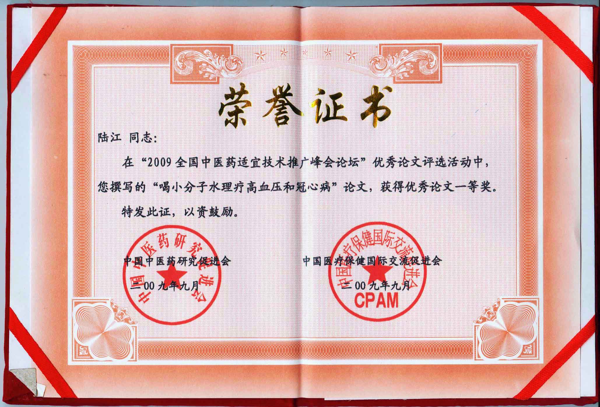 陸江的論文獲一等獎榮譽證書-- 陸江論文獲創新論文獎牌